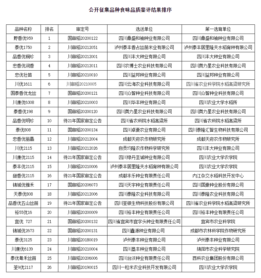位列全省公开征集的26个品种之一川康优2115同样如此。作为杂交水稻新品种,川康优2115 由省农业科学院作物研究所、四川农业大学和四川绿丹至诚种业有限公司共同培育而成。具有优质、高产、多抗、省肥、节药等特性,适合现代绿色高效种植模式,是一个投入少、产出多、米质优的高效绿色品种,有望成为继宜香优2115之后的又一大四川水稻品种。