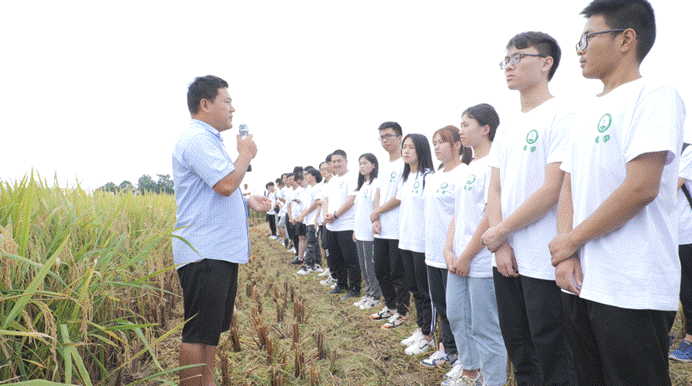 “宜香优2115”、“川康优2115”等水稻品种的选育者、生态农业研究所黄富教授在金黄的田地里为同学们授课。他讲述了三十多年来从事水稻的病害研究和抗病育种研究,一直致力于教学科研、服务乡村振兴工作,带领团队选育国家和省级主导品种“宜香优2115”、获四川省科技进步一等奖的事迹。他还向同学们重点介绍了现场展示水稻新品种“川康优2115”,该品种由乐竞体育平台官方网站、四川省农业科学院作物研究所、四川绿丹至诚种业有限公司利用“雅恢2115”和“川康606A”配组联合育成,“宜香优2115”和“川康优2115”是“同父异母”的兄弟,具有优质、高产、多抗、省肥、节药等特性。“我们要把论文写在祖国的大地上,踏踏实实做农科人”,黄富勉励同学们继续学好专业知识,为满足人民群众对美好生活的向往,确保国家粮食安全而奋斗。