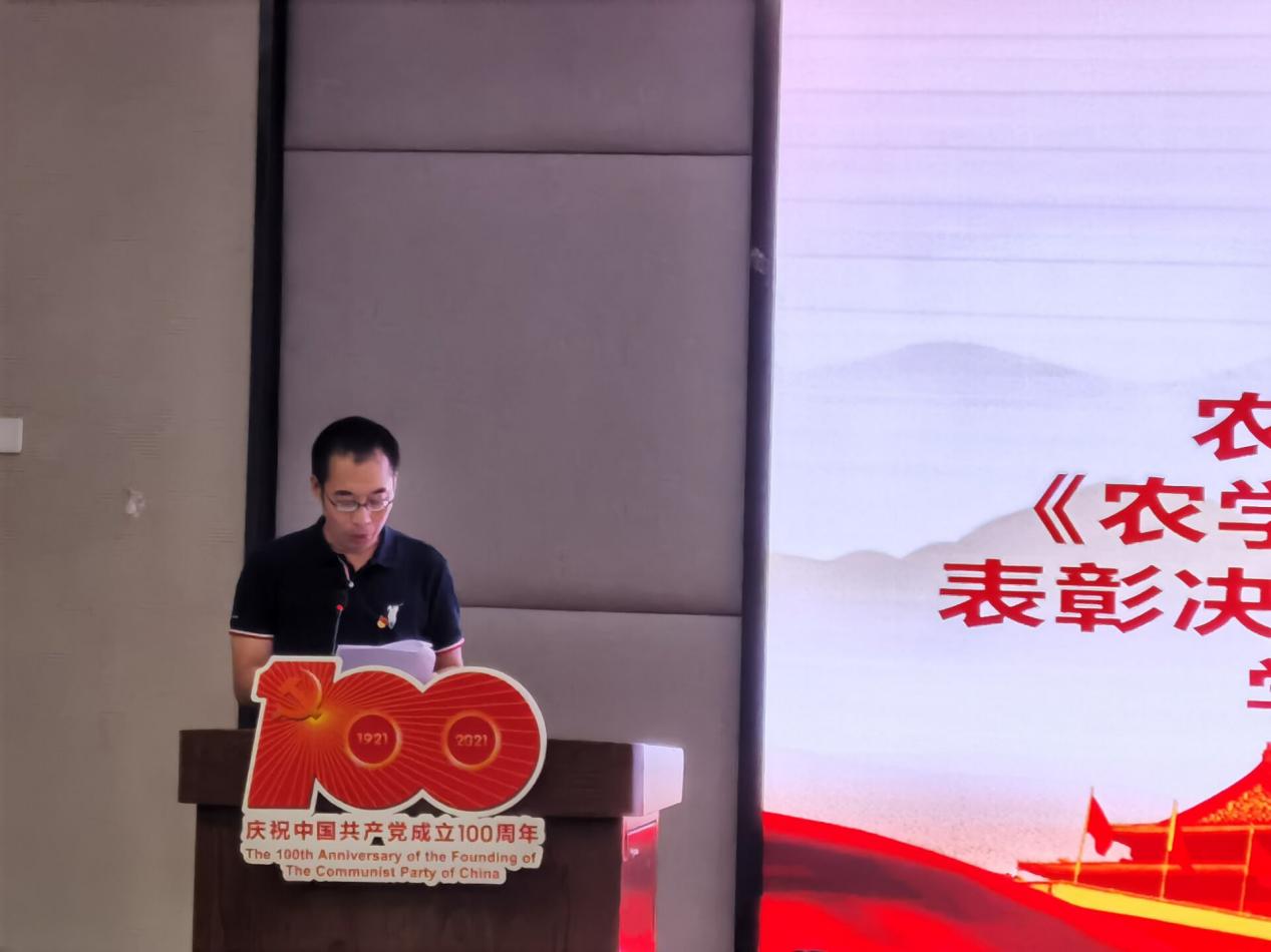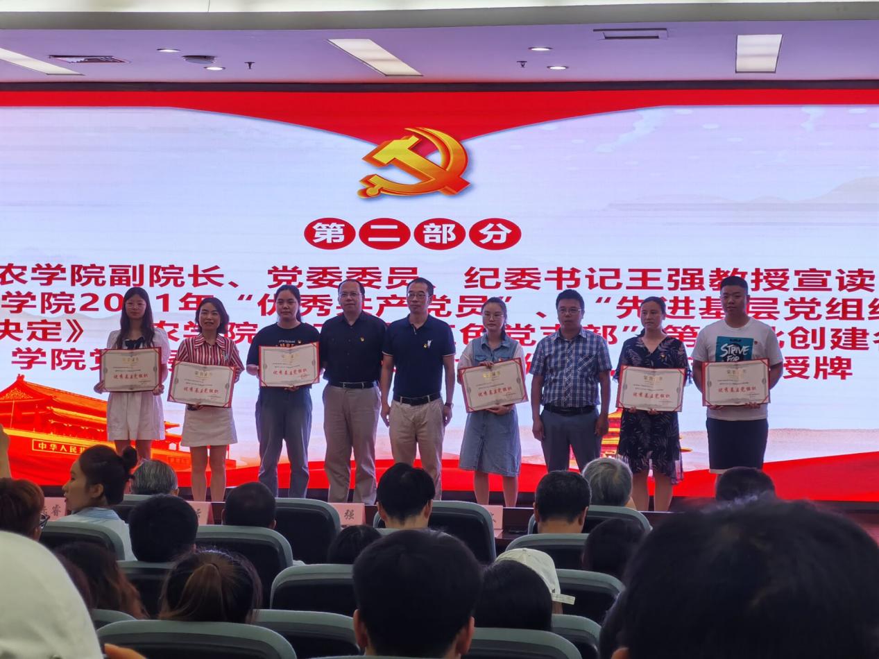 大会开始前,播放了学院党委对两位在党五十年的老党员刘熔山、江先炎老先生的访谈视频,视频中展现了两位老党员在党爱党、为人民服务的光荣事迹,也传递出老党员对年轻的师生党员同志进一步赓续奋进,传承红色基因的殷切期盼。随后,由农学院副院长、党委委员、纪委书记王强教授宣读了《农学院2021年“优秀共产党员”、“先进基层党组织”表彰决定及农学院江竹筠红色党支部”第一批创建名单》,学院党委、纪委委员分别为获表彰的10名院级“优秀共产党员”、6个“先进基层党组织”、5个“江竹筠红色党支部”创建单位的代表颁奖和授牌,表彰和肯定优秀的个人和组织在认真学习贯彻习近平新时代中国特色社会主义思想,扎实开展各项党建活动中的突出表现。