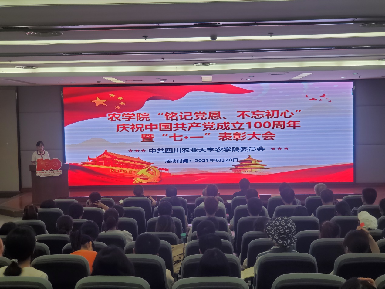 为庆祝中国共产党成立100周年,引领和激励农学院全体师生坚定理想信念,发扬党的传统和优良作风。6月28日下午,农学院于图书馆报告厅隆重举行“铭记党恩、不忘初心”庆祝中国共产党成立100周年暨“七·一”表彰大会。农学院党委委员、院长王际睿教授,农学院副院长、党委委员、纪委书记王强教授,农学院纪委委员雍太文教授,农学院纪委委员、教工作物遗传育种学党支部书记蒲至恩副教授,农学院关工委委员黄云教授和各教工、学生党支部的支部书记、党员代表以及2021年上半年新发展党员参与了本次大会。大会由农学院党委委员、党委办公室主任汤瑞瑞主持。