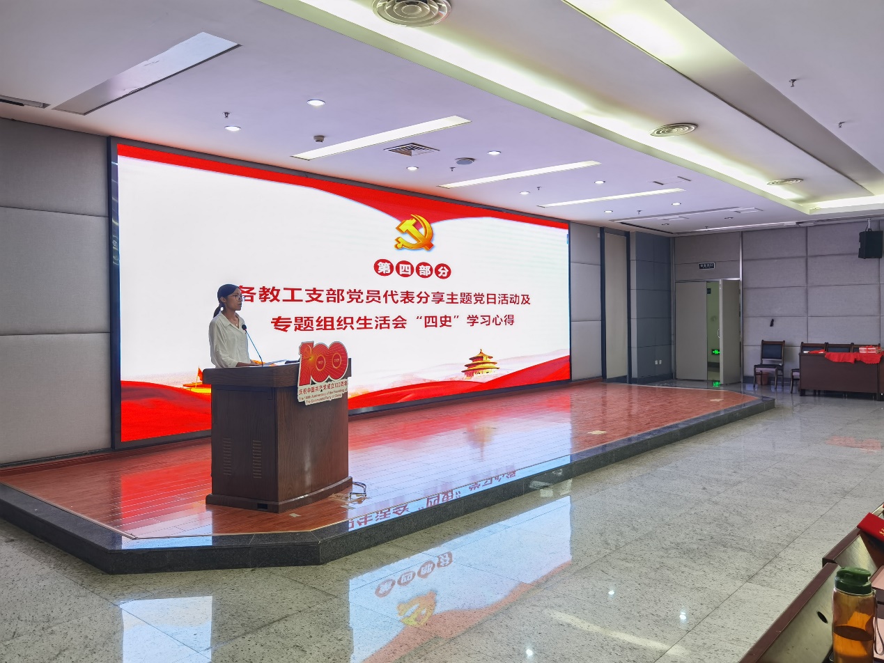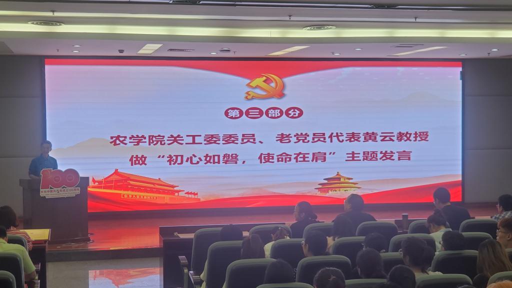 随后,农学院关工委委员、老党员代表黄云教授以“初心如磐,使命在肩”为题,分享了自己作为一名老党员在学习、工作中的经历和感受,展现了身为党员的强烈使命感和责任感,表达了老一辈党员对传承“川农大精神”的殷切嘱托。四个教工党支部的教师党员代表分别分享了各支部在七一前夕开展主题党日活动和专题组织生活会中学习“四史”的心得体会。四位代表分享了邓小平、罗瑞钦等老一辈革命家的伟大事迹和新一代大国功勋的光荣事迹,让人备受鼓舞。