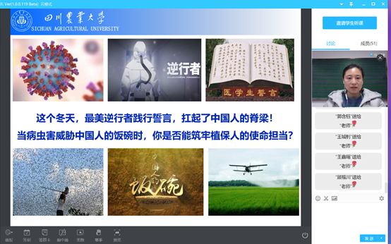 老师们还将抗击疫情的手段与课程内容相结合,激发学生的专业兴趣,提升专业归属感和责任感。新农村发展研究院的教授田孟良在《中医基础理论》第一课中,与学生分享了中医药在抗击新冠肺炎中的重要作用,鼓励学生们认真学习中医基础理论,用活用好祖国的瑰宝。植物保护学系副教授蒋春先在《普通昆虫学》中则用疫情中最美逆行者的故事,激发植物保护专业学生作为“植物医生”的使命感和责任感,鼓励学生们打赢未来的病虫害战争。“复课后的第一节课加第一次网络授课,虽然做足了准备但难免不适应和小紧张,课程使用了专业与思政结合和网络互动的方式,想到疫情心里有一些酸楚,当看到之前安静的讨论区不断滚动着学生们纷纷送上的鲜花,我当时特别感动,既为辛苦准备受到认可,更为此刻你我感同身受,我们植保人和白衣天使一样都有责任在肩,我相信国家无论何时需要,川农人也是能挺得起的!”课后,蒋春先激动地说。