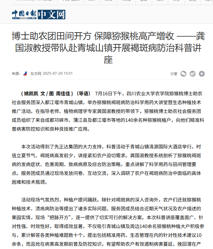 7月16日下午,乐竞体育平台官方网站猕猴桃博士助农社会服务团深入都江堰市青城山镇,举办猕猴桃褐斑病防治科学用药大讲堂暨生态种植技术推广活动。在指导老师、植物病理学专家龚国淑教授的带领下,猕猴桃博士助农社会服务团成员组织了来自成都邛崃市、蒲江县及都江堰市等地的140余名种猕猴桃植户,向他们精准科普病害防控知识和良种良技推广应用。