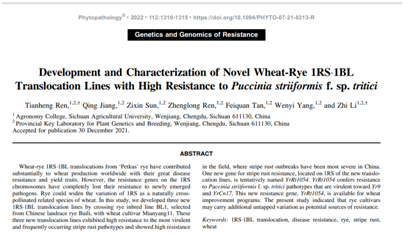 该研究以题目《Development and characterization of novel wheat-rye 1RS•1BL translocation lines with high resistance toPuccinia striiformisf. sp.tritici》在植物病理领域国际著名期刊《Phytopathology》作为封面论文发表。