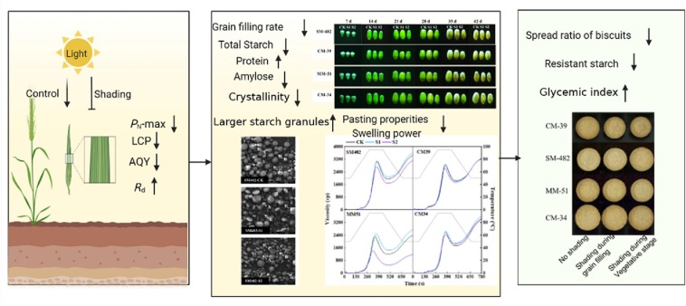 在西昌试验站进行遮阴时期和耐荫性品种的二因素试验,研究了全球暗化背景下叶片光响应特征、淀粉大分子结构和饼干烘焙品质的关系。研究发现:遮阴降低了小麦旗叶表观量子产量和最大净光合速率,从而降低淀粉合成速率和千粒重。花前遮阴提高了淀粉结晶度、粘度和饼干延展性。而花后遮阴降低了淀粉结晶度、淀粉粘度和饼干延展性。耐荫性小麦品种通过调控叶片光补偿点影响淀粉结构特征,从而提升饼干延展性。体外淀粉降解动力学试验证明:遮阴降低了抗性淀粉含量,提升小颗粒淀粉比例,从而提升饼干中淀粉的消化能力和食用后的升糖指数。研究结果验证了本文提出的重要假设:遮阴通过调控旗叶光响应特征调控淀粉大分子结构和饼干延展特征。耐荫性小麦通过调控叶片光响应特征调控淀粉结构从而获得较高的饼干烘焙品质。