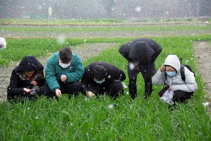 1月7日,成都迎来了2021年的第一场雪。农学院植物保护专业2018级的50余名同学在龚国淑教授、蒋素容、王海建、李沛利、尚静、常小丽、邱小燕等专业老师带领下,伴着风雪来到青浦园基地,开展了一场别开生面的课程教学实习。