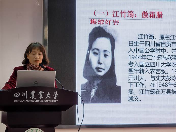 启动仪式伊始,黎明艳讲授了《川农大的红色基因》主题党课。她用大量的历史资料,讲述了江竹筠、张大成等为革命英烈校友的学习和成长故事,希望全体师生党员积极学习党史、校史,不忘初心使命,传承红色基因。