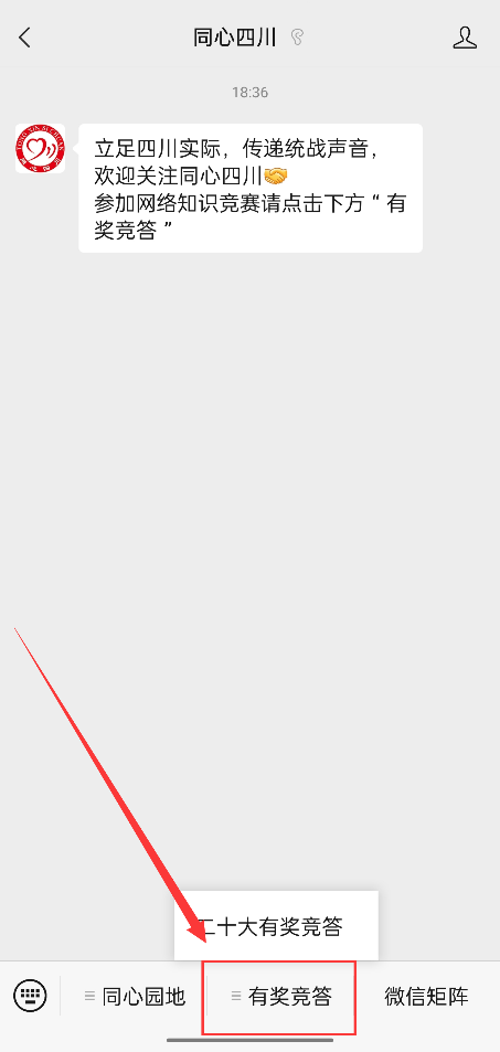 进入“同心四川”微信公众号,点击菜单栏底部“有奖竞答”进入答题界面,填写所在学校名称、个人姓名、手机号码后直接进行答题。