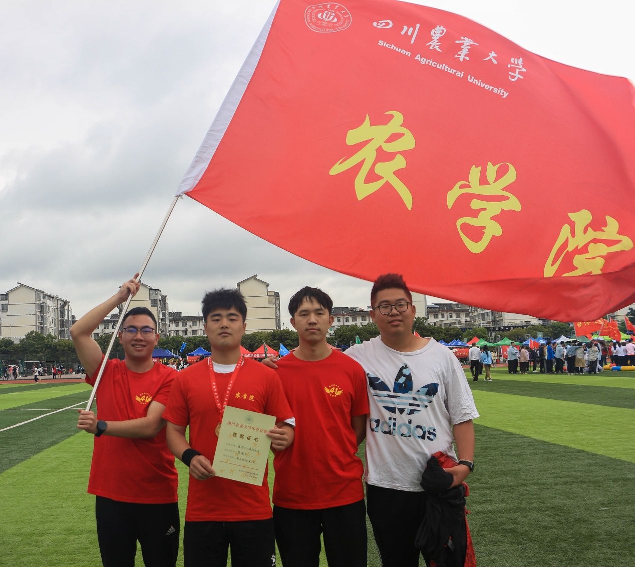 “农院,加油!农院,雄起!”只要是农院学子参与的比赛,农学院的大红旗帜一定会到场,农学院的学子们也自发组织到场,为农院家人加油。铅球、百米跑步、接力赛、集体项目……为农院加油的声音响彻操场上空。即使红日不出,农院旗帜也如红日一样高举于天空,与热闹嘹亮的加油声一起驱散阴雨绵绵带来的阴郁,给予着运动员们力量。
