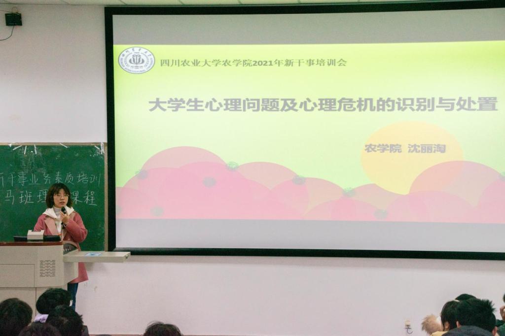 12月21日,农学院学生干部培训会第四讲在4A208教室召开,农学院团委老师沈丽淘应邀为大家作《大学生心理问题及心理危机的识别与处理》心理健康主题培训课。农学院2021-2022学年学生部门新干事和第二期青马班学员共计200多名同学到场参加学习。