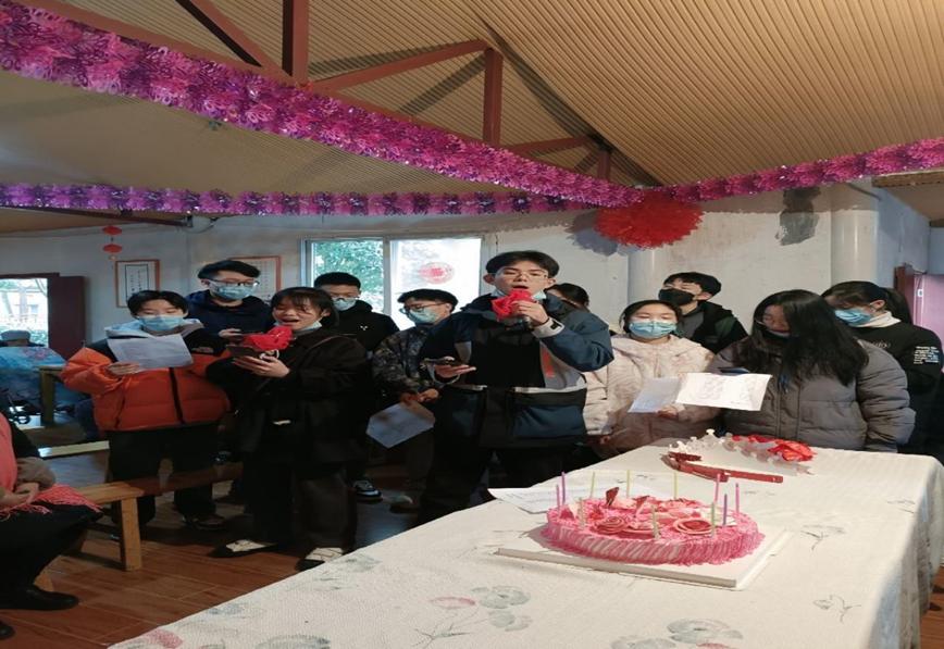 唱歌环节结束,又开始了下一个环节——为生日在一月的老人们庆生。同学们为过生日的老人们送上诸如福如东海、寿比南山等祝福语,并一起唱生日快乐歌,同学们将蛋糕端给每位老人,整个房间里都充满了欢声笑语。